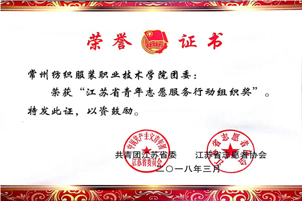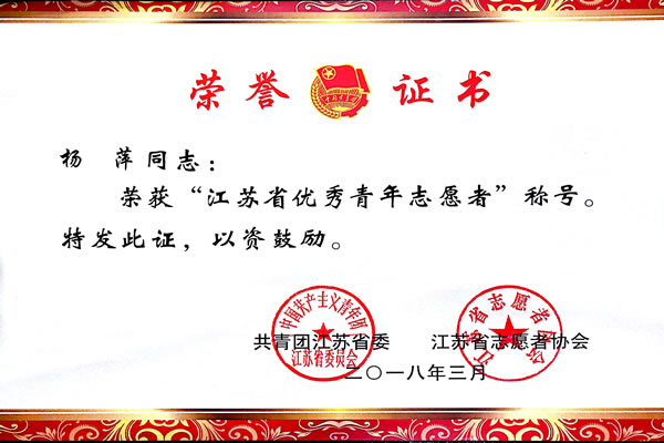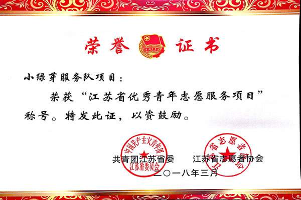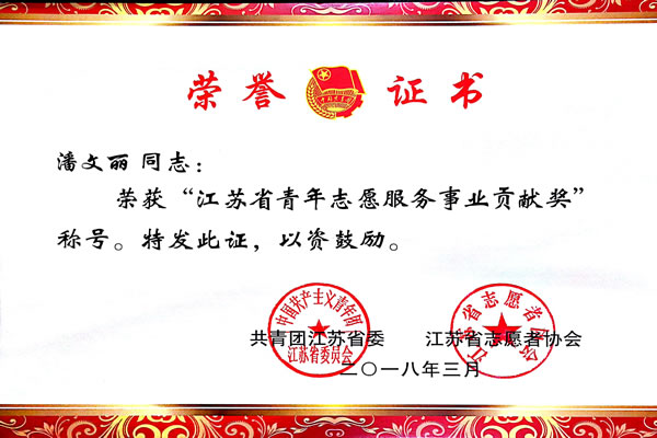 近日,团省委、江苏省志愿者协会下发了《关于表彰2017年度江苏省青年志愿者、志愿服务项目、志愿服务行动组织奖、志愿服务事业贡献奖的决定》,永利官网团委荣获“青年志愿服务行动组织奖”、纺织学院团委小绿芽服务队项目荣获“江苏省优秀青年志愿服务项目”称号、杨萍同志荣获“江苏省优秀青年志愿者”称号、潘文丽同志荣获“江苏省青年志愿服务事业贡献奖”称号。
