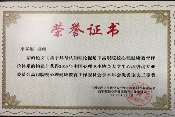 11月9日-10日,2018年全国高职院校心理健康教育学术年会在长沙民政职业技术学院召开。永利官网大学生心理健康教育中心黄甄汝参加了年会。本届学术年会以“高校心理健康教育中国特色的形成与挑战”为主题, 来自全国各省、市高职院校200余名院校领导和老师代表围绕心理健康教育进行了广泛交流。会议期间,永利官网李喜梅老师的论文《基于具身认知理论视角下高职院校心理健康教育评价体系的构建》荣获年会优秀论文三等奖。供稿:学工处大学生心理健康教育中心审核:夏斌