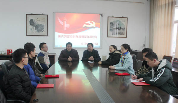 为了积极响应习近平总书记给南开大学8名新入伍大学生的回信,弘扬纺织学院拥军优属良好风尚,提高青年团员的保家卫国的思想意识,12月10日中午,纺织学院团委在学院会议室举办了拥军优属慰问活动。纺织学院党总支书记张锡春、副书记孙刘平慰问了退伍军人代表于虞皓天、杨顺、刘港、朱浩冉等四位同学。纺织学院学工党支部书记林继昌、学工办主任陈玳和团委书记、国防教育专职辅导员赵宜涛及2017级年级辅导员聂妍等参加座谈会。