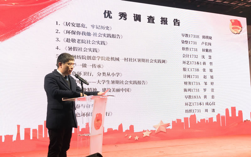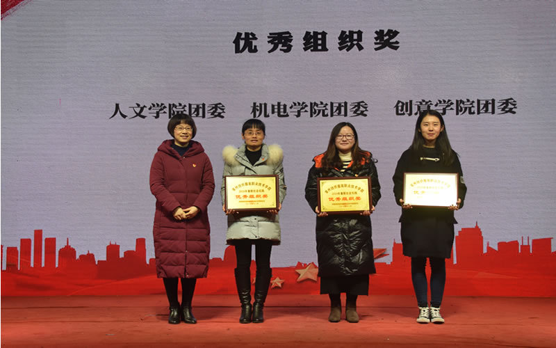 活动中,学校对2018年一二·九校园文化艺术节做了整体回顾,从2018年11月至2019年1月近2个月的时间里,全校共举办了“三走”青春运动大赛、红色文化知识竞赛、新时代精神宣讲大赛、创新创意创业设计类大赛等9场“致敬改革开放40周年,传承爱国情怀,展现常纺学子风貌”的校级大型活动,引领青年学生“听党话、跟党走”、“勤学习、多奋斗”,增强当代大学生的“四个自信”,活动参与人数达3000余人,为校园营造了良好的校园文化氛围,引导和帮助学生成人成才。经评审,最终创意学院团委、纺织学院团委、服装学院团委荣获本次艺术节最佳团队奖,经贸学院团委、机电学院团委、人文学院团委获优秀组织奖。