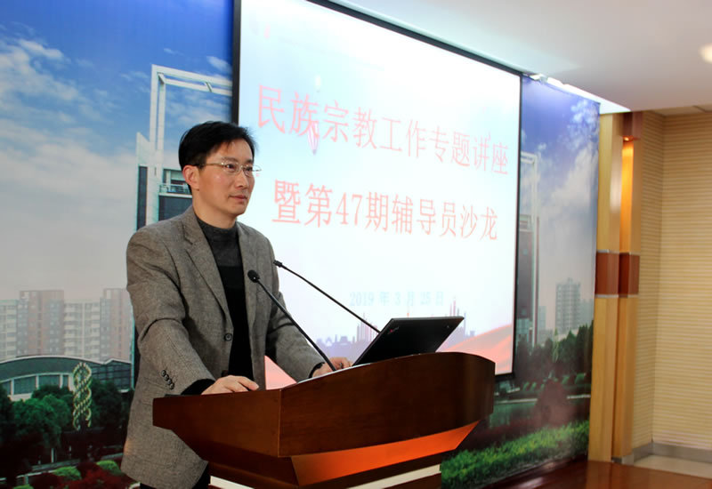 为提高新形势下全校各基层党组织、学工队伍对民族宗教工作的认识,推动党的民族宗教政策进教材、进课堂、进头脑,3月25日下午,学校党委统战部、学工部、党校联合举办“党组织负责人培训暨辅导员沙龙”。学校党委委员、统战部部长高江荣作了《我国的民族宗教政策》专题培训。各党总支(直属党支部)全体委员、党支部书记、全体辅导员90余人参加培训。
