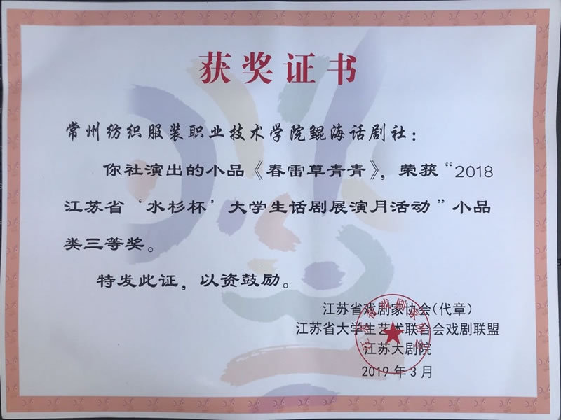 近日,经贸学院团委选送的鲲海话剧社作品《春雷草青青》在2018江苏省“水杉杯”大学生话剧展演活动中荣获小品类三等奖。