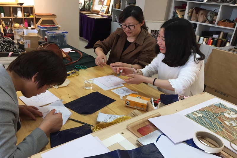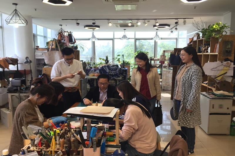 李爱红根据江苏康乃馨集团的交流学习要求,结合专业产品知识,安排大家先后参观了皮具设计工作室、时尚礼品设计工作室、面料陈列馆、服饰文化馆、陶艺大师工作室、乱针绣大师工作室等,分组体验了“掐丝”工艺、“皮具”工艺制作近3小时。