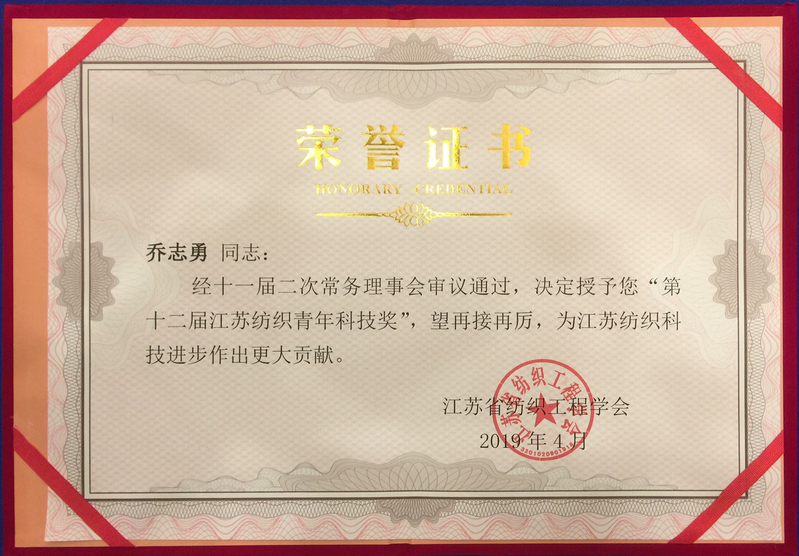 近日,在江苏省纺织工程学会第11届理事会第二次扩大会议暨2019年江苏学术年会、学会设奖表彰大会上,永利官网纺织学院青年教师乔志勇荣获“第十二届江苏纺织青年科技奖”。该奖项由江苏省纺织工程学会组织,每两年评选一次,此次全省共有12位纺织青年科技工作者获得此项荣誉。