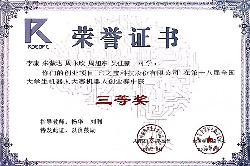 8月19-21日,由共青团中央、中华全国学联主办,共青团黑龙江省委、哈尔滨工业大学、黑龙江省工业技术研究院和宁波市高层次人才服务中心承办的第十八届全国大学生机器人大赛机器人创业赛在哈尔滨工业大学举行。永利官网机电学院团委推荐的科技苑参赛项目《印之宝科技股份有限公司》荣获三等奖,学校获得优秀组织奖。