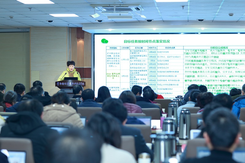 汇报环节,会议从现场31个部门和二级学院中随机选取了党委办公室(院长办公室)、实训中心、人事处(党委教师工作部)、继续教育处、创意学院共5个部门,由部门负责人汇报了2019年度党政工作要点落实情况和一页纸报表任务完成情况,对未完成任务进行了原因说明,并回答了现场提问。洪霄院长对5个部门汇报情况进行了逐一点评,充分肯定了各部门取得的成绩,并指出了存在的不足。
