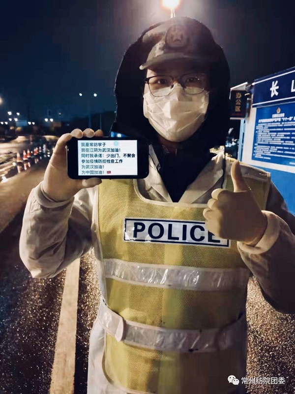 经贸学院发挥辅导员成员精干、年轻多能的特点,老师们秒变“主播”,通过各类视频软件各展绝技,分子的国贸1931班学生黄凯,不忘战旗下“若有战,召必回”的誓言,一直坚守战“疫”一线,配合交警对进入江阴的车辆进行防疫检查,其中连续多日每天站立近10小时。
