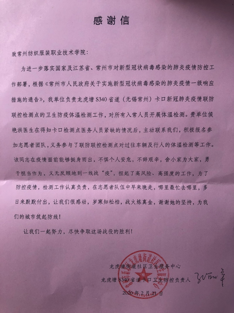 收到感谢信后,学校党委高度重视,党委书记蒋心亚看望了到校值班的侯艳洪同志,对她的志愿服务行为给与肯定,要求她在做志愿服务的同时一定注意自身的安全。后勤处、机关党总支领导都电话送去关心和慰问。党委书记蒋心亚同志在感谢信的批示上指出“侯医生的行动是常纺师生抗疫群像的生动写照,作为一名医生,她体现了良好的职业担当和奉献精神;作为一名入党积极分子,她以共产党员的标准要求自己,关键时刻经得起考察和检验。一个人能做多少事情不重要,重要的是要有情怀有境界。为常州人民守护大门,保一方平安祥和,是我们大家的责任,而侯医生用自己的志愿者行动来践行。大爱无声,医者仁心,常纺以这样的员工为傲。”