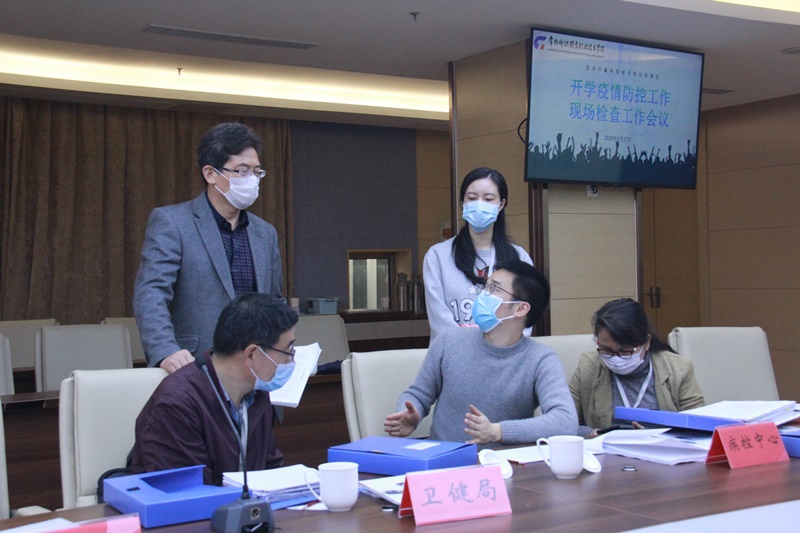 洪霄代表学校向工作组汇报永利官网联防联控机制、开学返校方案、师生情况摸排及防疫物资准备等防疫工作开展情况,联防联控工作组对照“常州科教城高校开学准备工作验收标准”,对永利官网疫情防控工作预案制定、应急演练开展、校园清洁消毒、防控条件保障等方面进行了督查。并对永利官网各门岗、学生食堂、学生公寓、医学隔离观察点等重点场所进行了实地现场查看。工作组对学校的疫情防控和开学准备工作给予了肯定,并提出了整改意见和完善建议。