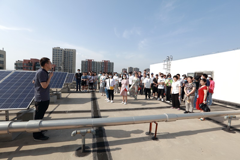 活动中,师生们来到实训中心楼顶,讲解员向大家介绍了光伏发电站建设及光伏发电系统的工作原理,并且指出光伏发电站年发电量约11万千瓦时,每年可节约电费约6万元。在绿化喷灌系统、生态冲沟小游园区域,了解了绿化喷灌系统运行模式和生态冲沟的理念、基础结构和植物组成,而且亲身体验到了多样性植物、高绿化覆盖率带来的温差效果。