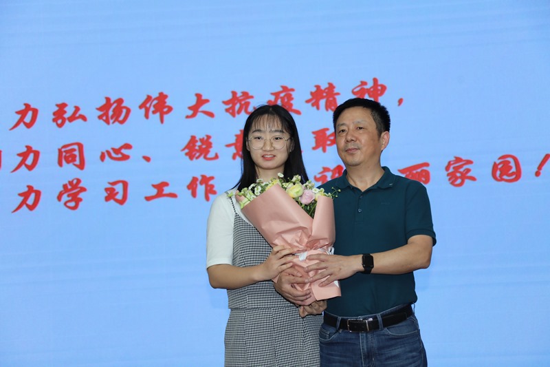 徐医生首先与参会师生分享了参加全国抗击新冠肺炎疫情表彰大会的激动心情。随后,以“弘扬抗疫精神、护佑百姓健康”为主题,讲述了面对突如其来的严重疫情,医护人员白衣为甲,“疫”无反顾,“疫”然前行,来不及多考虑,迅速投入到遭遇战阻击战中,与病毒作斗争,与患者零距离接触,不畏风险救治患者,冲锋在疫情防控第一线,筑起了抗击疫情的钢铁长城的不凡事迹。徐医生为方便工作,避免传染家人和他人,从1月21日起以院为家,从寒冬到初夏,驻院整整108天。他认为,抗疫的医护人员不是“从天而降的英雄,只是挺身而出的凡人”。
