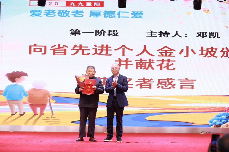 党委书记吴访升向获“全省离退休干部先进个人”老领导金小坡颁发荣誉证书、奖牌及奖金,并献花