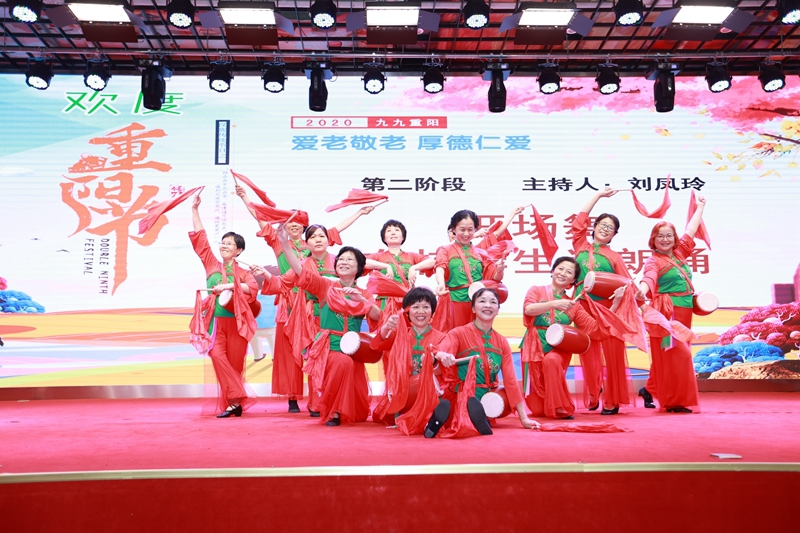第二阶段文艺汇报演出由退休教师刘凤玲副教授主持。退协舞蹈俱乐部蔡苏英等12位老师表演了腰鼓舞《好日子》、民族舞《桥边姑娘》和《心上的罗加》,并向80岁以上老同志敬菊花茶:祝他们强健身体,延年益寿!为80岁以上老同志佩戴茱萸香囊:祝他们避邪消灾,吉祥安康!太极俱乐部严文玉等14位老师表演了拳剑扇串烧《我的祖国》;参加老年大学声乐学习班的王一曙表演了男生独唱《多情的土地》、高国良老师表演了小提琴独奏《梁祝》、张建成老师表演了萨克斯独奏《父亲的草原母亲的河》;学生代表向老同志献上了诗朗诵《献给值得敬佩的你们》。