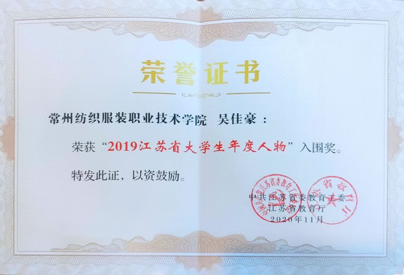 11月15日,由江苏省委教育工委、江苏省教育厅组织开展的“2019江苏省大学生年度人物暨2019江苏高校辅导员年度人物”颁奖典礼在南京工业职业技术大学隆重举行。此次共评选出“2019江苏省大学生年度人物”10名、提名奖18名、入围奖40名,永利官网机电学院模具设计与制造专业2017级学生吴佳豪从全省申报的120名大学生中脱颖而出,荣获“2019江苏省大学生年度人物”入围奖。永利官网已连续四年获得江苏省“大学生年度人物”入围奖。