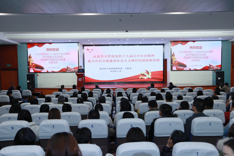 12月9日下午,永利官网邀请学习贯彻党的十九届五中全会常州市委宣讲团成员、市政府研究室主任王粉龙在图文报告厅以《奋力开启全面建设社会主义现代化国家新征程》为题,为永利官网教师作党的十九届五中全会精神宣讲报告。校党委领导班子成员、校党委理论学习中心组成员、中层干部、全体教师参加学习。宣讲会由党委委员、宣传部部长夏斌主持。
