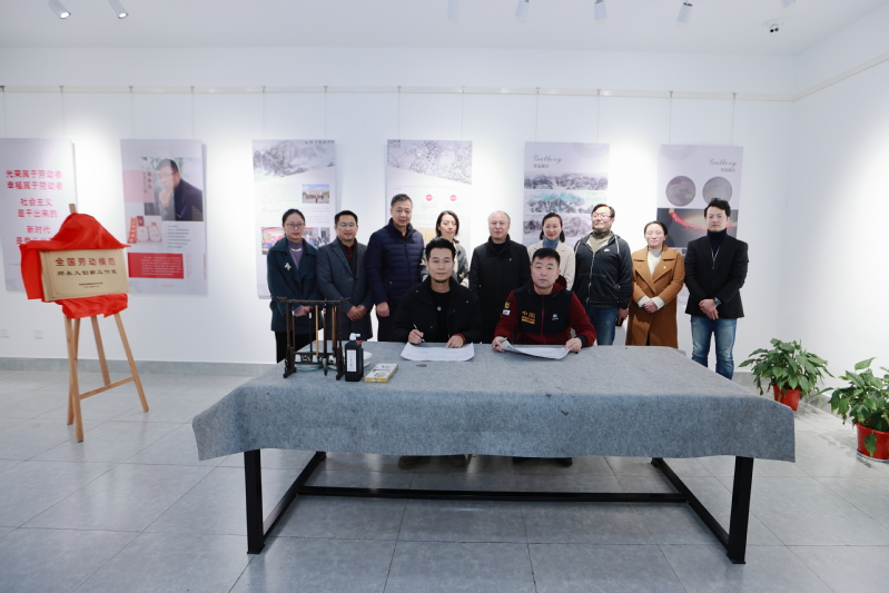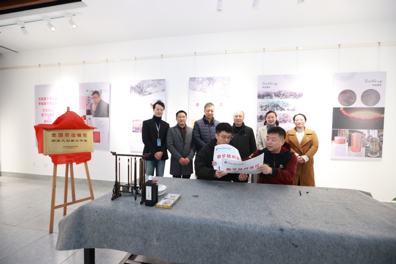 上午,邓永久在党委书记吴访升陪同下来到学校为其专门设置的“全国劳动模范邓永久创新工作室”,工作室内首先印入眼帘的是习近平总书记在全国劳动模范和先进工作者表彰大会上的讲话精神:“光荣属于劳动者、幸福属于劳动者,社会主义是干出来的、新时代是奋斗出来的。”工作室里还展出了邓永久从学习到工作的经历、先进事迹,以及他的部分作品。