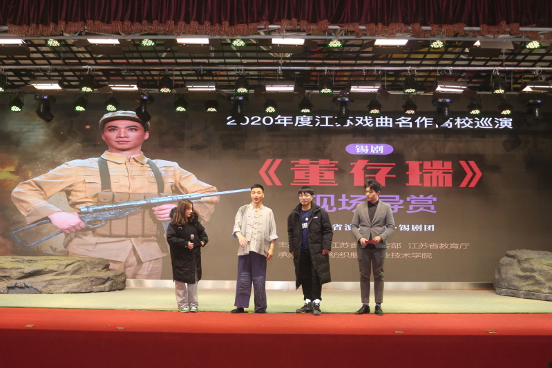 演出正式开始前,董存瑞的饰演者,国家级非物质文化遗产锡剧传承人,著名锡剧表演艺术家,国家一级演员,第十九届中国戏剧梅花奖获得者周东亮老师,他为观众进行了一场生动的剧目导赏。周东亮介绍说,《董存瑞》是首次将董存瑞的故事搬上舞台,“这部戏主要讲了董存瑞的成长史,从不成熟到逐渐有了坚定的信念。在这个过程中,我们用了很多戏曲程式的东西来展现,也融合现在流行的管乐的元素,所以它不同于一般的传统戏,它是具有时代性的锡剧。”在现场,他还与学生互动,教唱了学生一段《双推磨》,“推呀拉呀转又转,磨儿转得圆又圆……”在一段轻快活泼的锡剧导学中,同学们感受到了传统文化的深厚魅力。