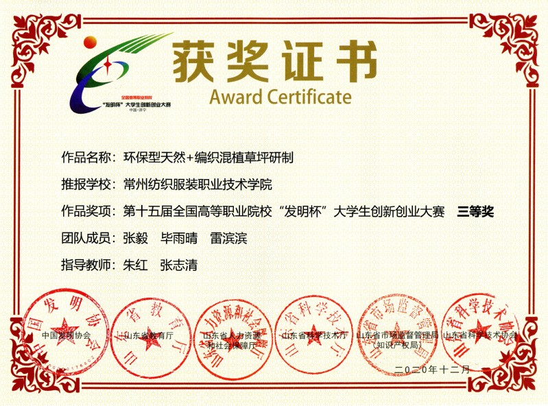经过激烈角逐,永利官网纺织学院曹红梅老师、胡志良老师指导作品“一种真丝织物预处理及用天然植物染料印花的方法”获得大赛专利发明展及评选一等奖。永利官网纺织学院朱红老师、张志清老师指导作品“环保型天然+编织混植草坪研制”获得大赛发明制作类三等奖。