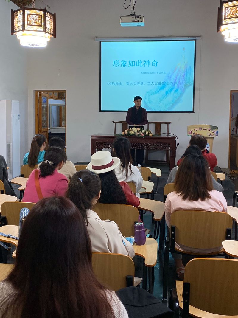 开幕式后,在查家湾乡村振兴学堂还举办了由美妆大咖粱义先生主讲的《形象如此神奇》的美妆穿搭讲座,使在场的人文师生受益匪浅。