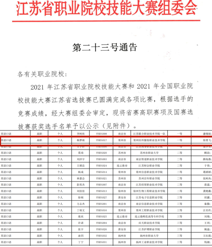 江苏省职业院校技能大赛组委会4月30日公布了2021年全国职业院校技能大赛江苏省选拔赛获奖名单,人文学院商务英语1831学生杨梦雨在徐勇飞、邹莹、丁馨三位老师的指导下,经过激烈比拼,在33名参赛选手中以第二名的成绩获得英语口语赛项一等奖;老年服务与管理专业学生朱斯凡在周飞、周聪聪等教师带领下,参加“养老服务”技能大赛选拔赛,荣获省三等奖,实现该赛事奖项的零突破。