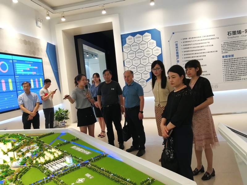 团队一行首先参观了中国石墨烯科技产业展示馆,了解石墨烯小镇的规划、石墨烯产业的发展概况及新型碳材料产业集群建设总体情况,大家就传统纺织材料如何与石墨烯碰撞开发新产品,如石墨烯发热服、石墨烯口罩、PA6原位聚合等方向进行了互动交流。