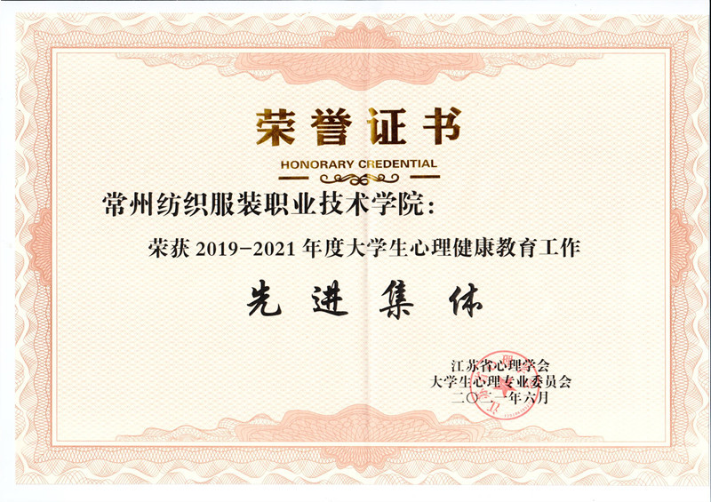 近日,在江苏省心理学会大学生心理专业委员会2021年年会表彰中,永利官网荣获江苏省2019-2021年度“大学生心理健康教育工作先进集体”荣誉称号,永利官网在本次表彰中经过层层筛选,成为全省24所获奖高校之一,这是对永利官网近年来扎实开展大学生心理健康教育工作的肯定,学校心理健康教育工作迈上新台阶。