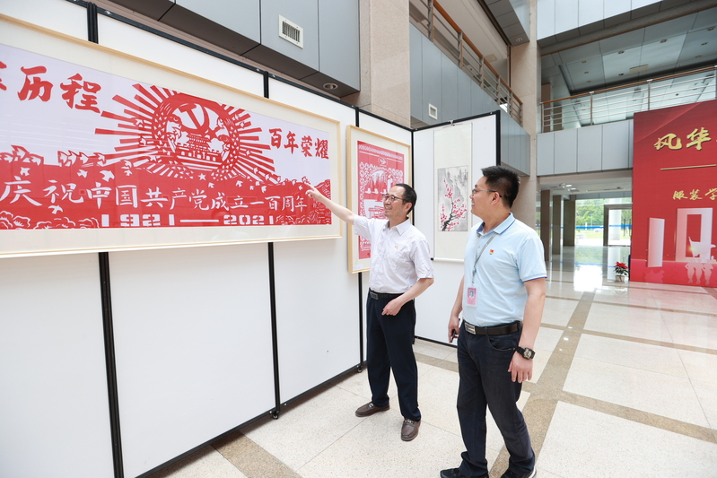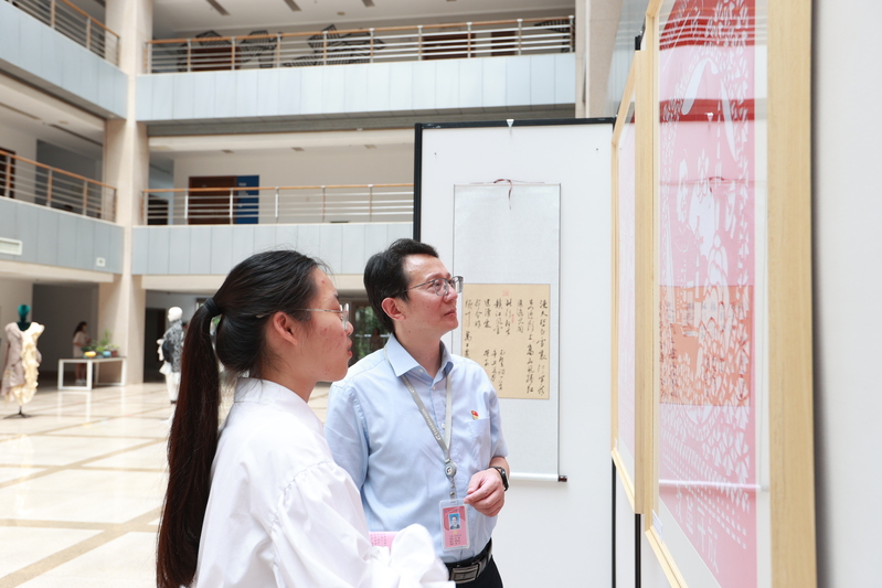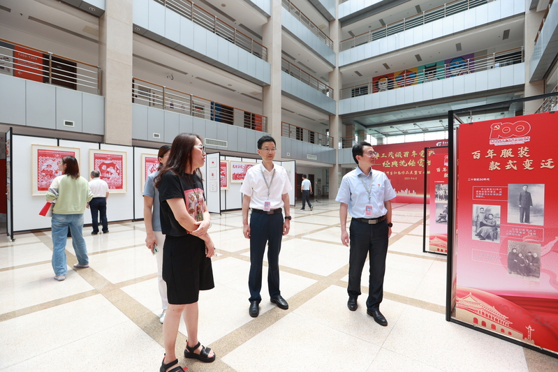 为庆祝中国共产党成立100周年,深入学习贯彻习近平新时代中国特色社会主义思想和党的十九大精神,深入领会习近平总书记对艺术创作和美育内涵论述的重大现实意义,凝聚服装学院教师同心共筑中国梦的强大精神力量,服装学院师生和剪纸社、优编坊等社团的同学共同创作了一批艺术作品, 6月16日中午,由服装学院主办的“风华正茂颂百年党史,经典流传赏世纪华裳”师生红色作品展暨百年服饰文化变迁展在7号楼文化展示中心一楼大厅举行。