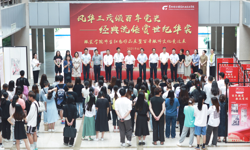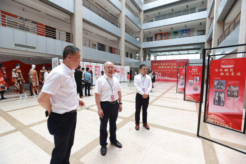 开幕式结束后,现场领导、嘉宾和师生参观了“风华正茂颂百年党史,经典流传赏世纪华裳”师生红色作品展暨百年服饰文化变迁展。