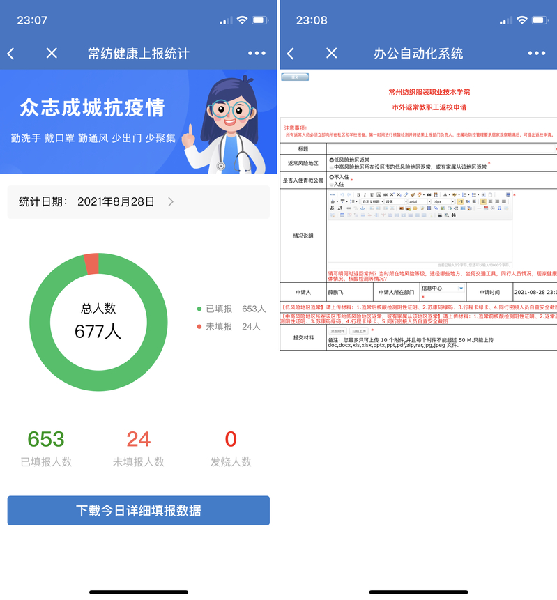这个暑期疫情防控形势严峻复杂,学校防控任务艰巨繁重,信息服务中心积极响应学校号召,共克时艰,让信息化手段在防控战“疫”派上用武之地,如每日健康上报系统、市外教职工返校流程等。