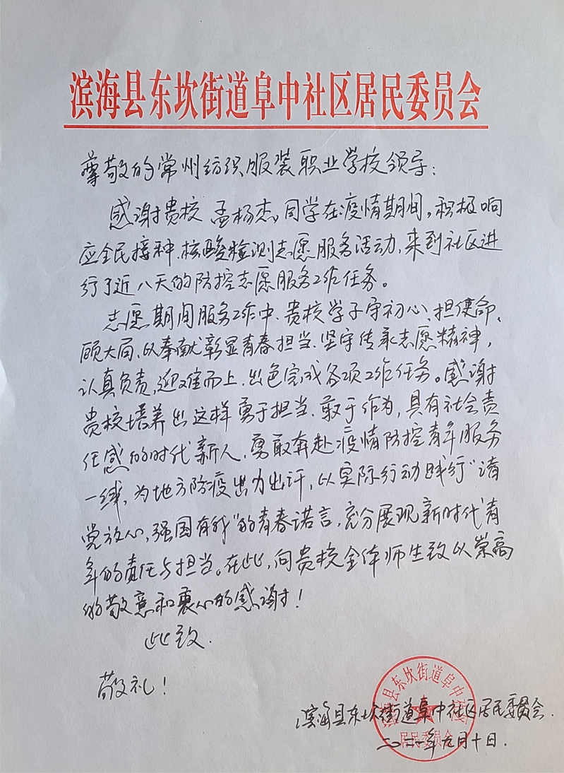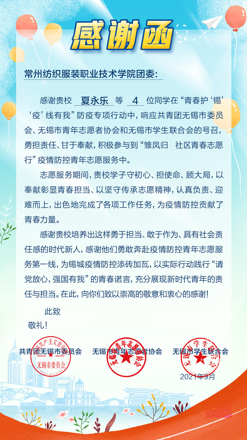 近日,永利官网分别收到来自共青团无锡市委员会、无锡市青年志愿者协会、无锡市学生联合会和滨海县东坎街道阜中社区的感谢信。信中分别感谢了永利官网人文学院夏永乐、曹嘉柠、王一凡,机电学院左枫凡和经贸学院孟杨杰在当地社区疫情防控工作期间作出的贡献。5位同学用新时代青年的勇气与担当、热情与坚守,赢得了社会的肯定,为当地的防疫工作提供了有温度、有力度的服务保障。