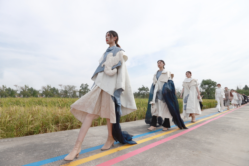 走秀活动以田间小径为T台,自然风光为底色,稻田和民宿为背景,伴随着轻快灵动的音乐,20多位学生模特完美演绎了学生自己设计的创意服装。“无界”将现代艺术与传统织造工艺、乡村自然风景紧密结合融为一体,在东南村丰收的千亩稻田上惊艳亮相,引得现场的观众和村民们啧啧称赞。本次活动由搜狐焦点进行现场直播,受到2万多人线上实时关注,常州日报、常州电视台进行了现场采访。