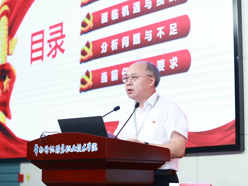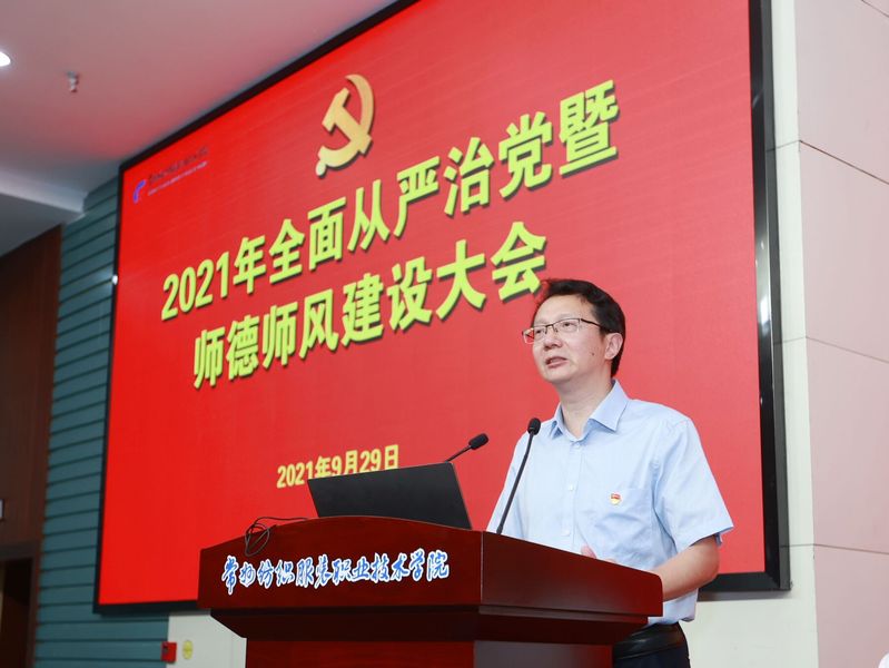 党委书记吴访升在会上作了题为《师生至上,正本清源,团结一心向前看》的讲话。他回顾了一年来学校高质量党建领航护航高质量发展的态势,深刻分析了目前学校发展面临的机遇与挑战、瓶颈与短板,并就推进学校全面从严治党和师德师风建设提出三点要求:一是突出政治建设,强化思想引领,提振积极卓越的精神状态;二是聚焦作风建设,强化师德师风,涵养风清气正的政治生态;三是严格目标管理,强化政治担当,营造团结奋进的发展势态。吴访升强调,奔跑在“现代化、国际化、智慧型、创业型”高水平高职院校建设的奋进之路上,各级领导班子和党员干部要带头讲政治、讲团结、顾大局,广大教师要讲师德、讲奉献、谋合作,团结一切可以团结的力量、集聚一切可以集聚的资源,不当旁观者、跟随者,要做推动者、领跑者,共同干事创业,共同干成伟业,共同为学校事业发展提供强有力的支撑保障,以党的建设高质量推动学校事业发展高质量。