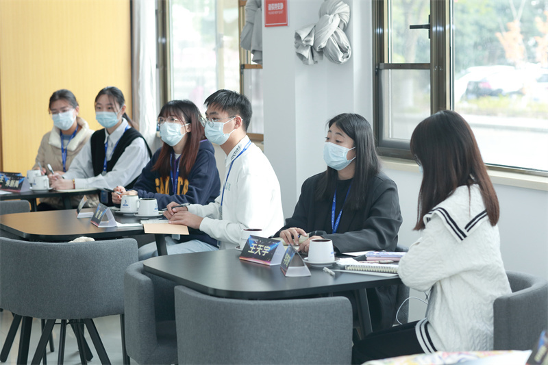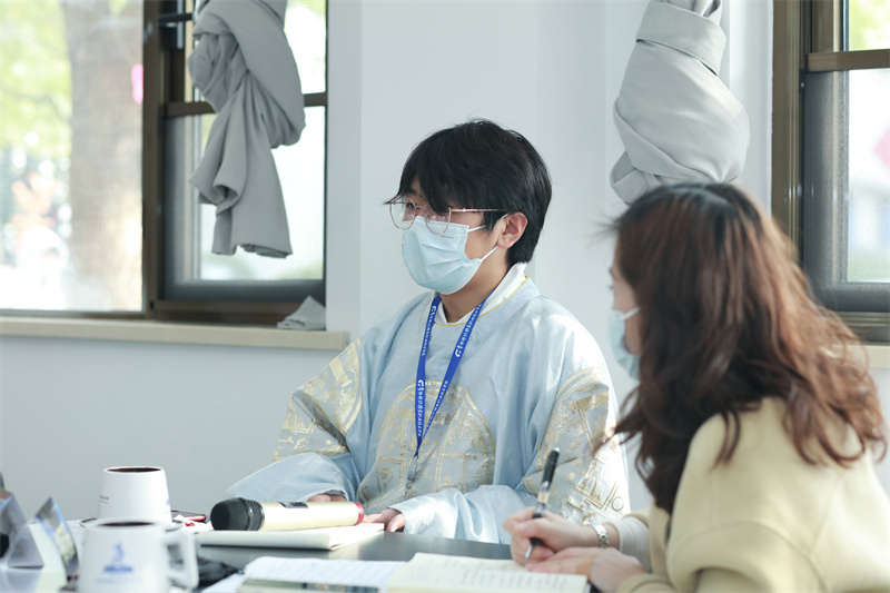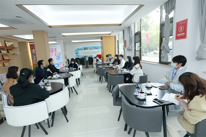服装学院曾同学十分热爱中华优秀传统文化,张震宇介绍了学校社团巡礼月活动和国学社、非遗社、剪纸社等中华传统文化类社团的基本情况,鼓励他积极投入第二课堂的文化活动,将中华传统文化与服装专业相结合,在常纺校园里充分发展,留下美好回忆。