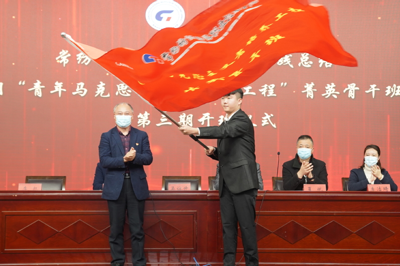 吴访升为第三期“青马工程”菁英骨干培训班授班旗,为新一期学员代表赠送书籍《中国共产党简史》,希望各位学员扛起青马的意志,学好党的历史,不负党的栽培和重托,共同学习、共同努力、真正担起“青年马克思主义者”的重任。第三期青马班班长机电学院机制203C班张海波接旗。