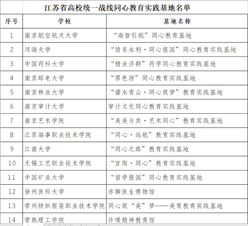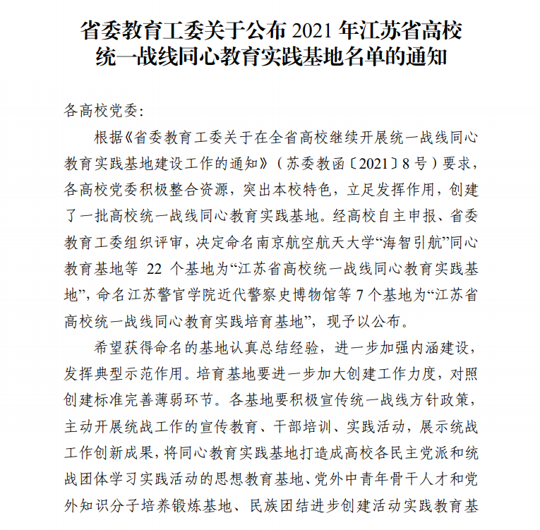 江苏省高校统一战线同心教育实践基地创建是江苏省委教育工委在全省高校开展的一项统战工作新举措,旨在以基地建设为平台,整合学校部门、院系、学术团体、民主党派基层组织、统战团体等各方资源,在弘扬党的统战文化优良传统、形成具有鲜明特色的统战教育品牌、强化党外人士思想政治引导等方面培育新载体、凝聚新动能、形成新突破,有力推动高校党外知识分子思想政治工作创新发展。