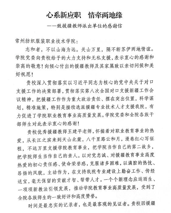 近日学校收到来自新疆应用职业技术学院党委的一封题为《心系新应职 情牵两地缘》的感谢信。感谢永利官网纺织学院王建平老师两赴新疆,支援新疆应用职业技术学院建设。