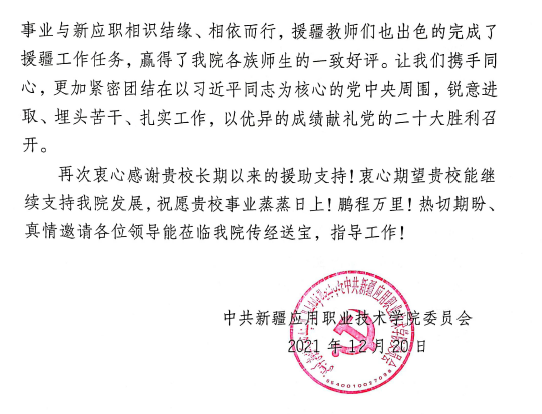 新疆应用职业技术学院党委寄来的感谢信