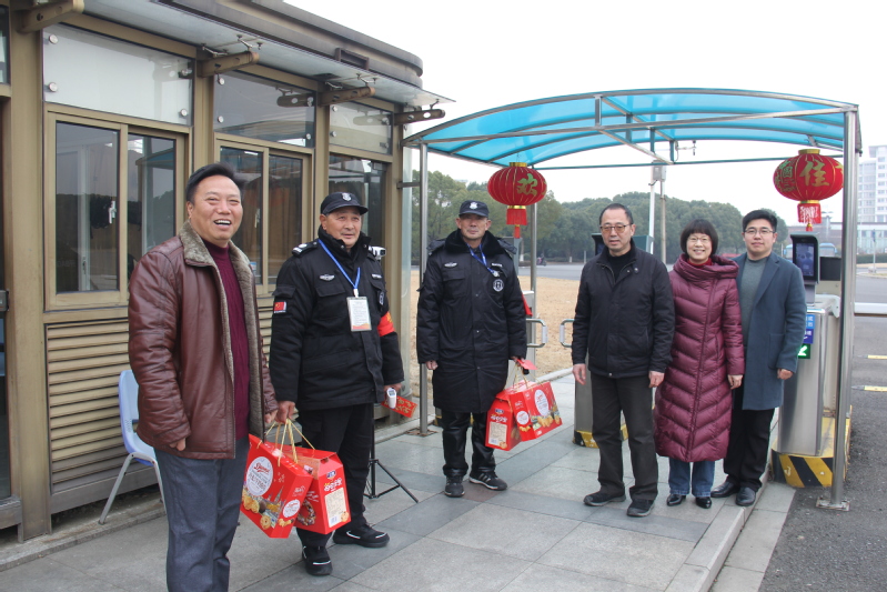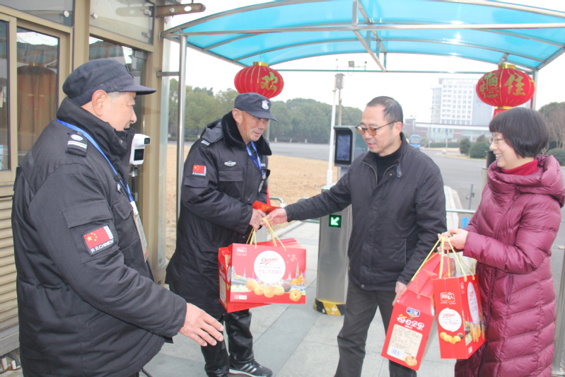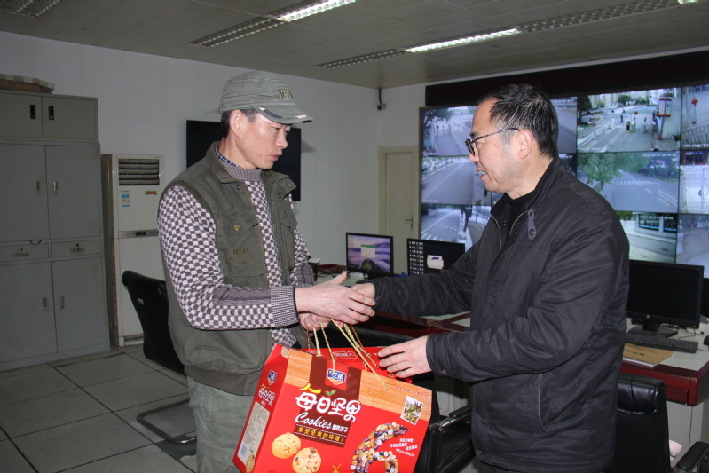 邓凯一行先后来到学校校门值班岗亭、监控中心、驾驶班、楼宇物业、学生公寓和学校值班室等单位和区域,看望慰问工作岗位上的教职员工。走访中,邓凯详细了解了寒假期间校园疫情防控、安全保卫、后勤保障等相关工作情况,都与值班人员亲切握手、交谈,代表学校为他们送上节日慰问品,向他们及其家人致以诚挚问候和新春祝福,感谢大家节日期间坚守岗位,保障春节及寒假期间学校安全稳定和正常运转;感谢他们过去一年的辛勤付出,希望大家新的一年各方面都有所进步,身体健康,阖家幸福。校领导的真诚问候与祝福,让坚守岗位的工作人员倍感温暖。他们表示尽管不能与家人一起团聚过年,但一定会站好春节这班岗,决不辜负学校党政和全校师生的殷切期望,尽心尽责,为全校教职员工度过一个快乐、祥和、平安的春节做好各项服务与保障工作。