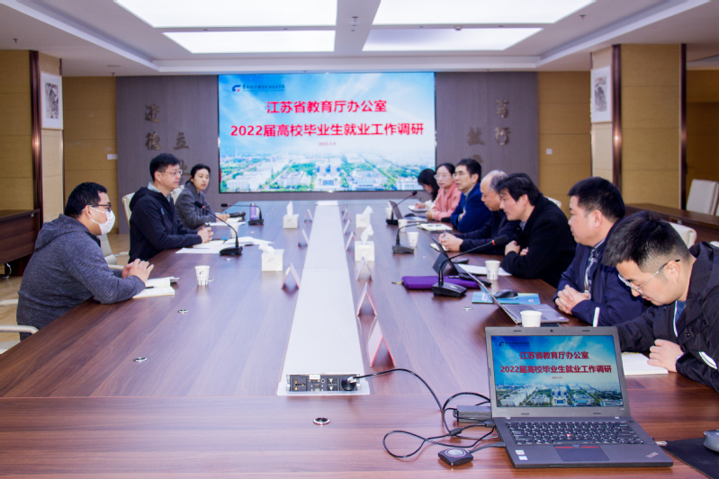 3月9日上午,江苏省高校招生就业指导中心副主任黄炜、陈登峰、倪前龙一行3人莅临永利官网调研指导2022届毕业生就业工作,永利官网党委书记吴访升、党委委员、副院长张震宇、招生就业处处长董裕乾、教务处副处长祝燕芳、创业学院副院长王磊以及就业工作人员参加调研会,会议由张震宇主持。