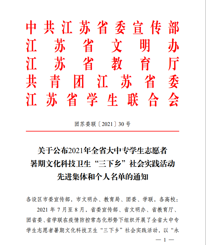 近日,江苏省委宣传部、省文明办、省教育厅、团省委、省学联五部门联合发文,对2021年全省大中专学生志愿者暑期文化科技卫生“三下乡”社会实践活动先进集体和个人进行表彰。