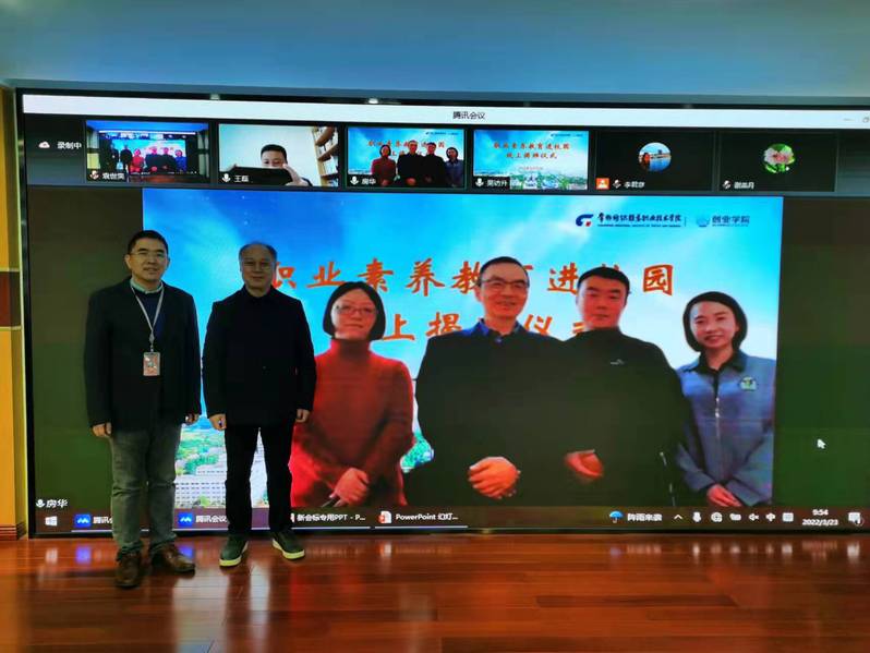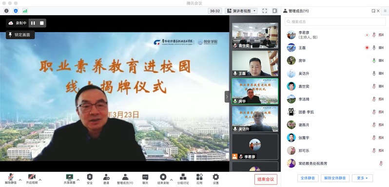 3月23日上午,学校通过腾讯会议举行了“职业素养教育进院校工程”线上揭牌仪式。北京修证公益基金会理事长许琼林、秘书长刘寅峰、项目官员许冬悦、院校部主任房华,学校党委书记吴访升,党委委员、副院长张震宇,学生工作处处长李洁琦,校团委书记李凯,教务处副处长祝燕芳等参加了会议,会议由创业学院副院长王磊主持。