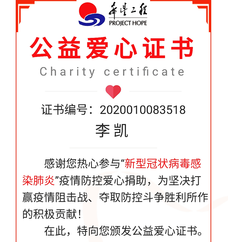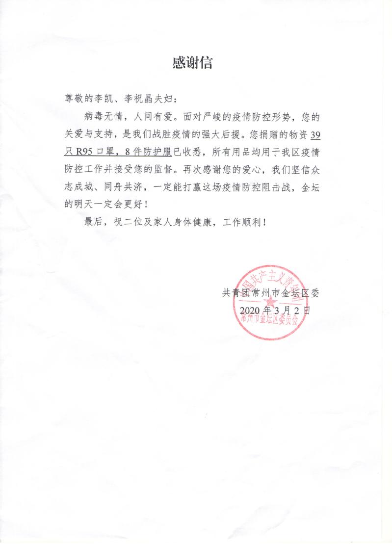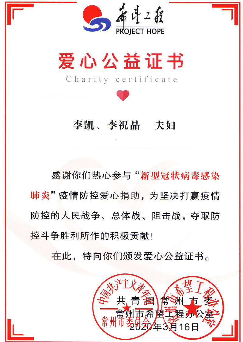 虽然战场不同,但战斗的使命相同。这已经不是李凯、李祝晶这对夫妻第一次携手抗疫了,2020年初在新冠肺炎病毒首次爆发,武汉疫情严重,夫妻俩第一时间通过希望工程“苏青益筹”平台向武汉一线捐助了抗疫资金。后来疫情蔓延至全国多个地方,当得知一线医疗物资急剧短缺之时,看到一线人员用生命在战斗,夫妻俩忧心忡忡,多方联系各种途径,最终通过国外的朋友,自费1万多元高价分批从国外购得医用防护服和口罩,分别捐赠给了武汉市青山区隔离点、金坛团市委、yl6809永利官网等当时疫情防控的一线,希望能用自己的力量为这个国家作出一丝丝贡献。