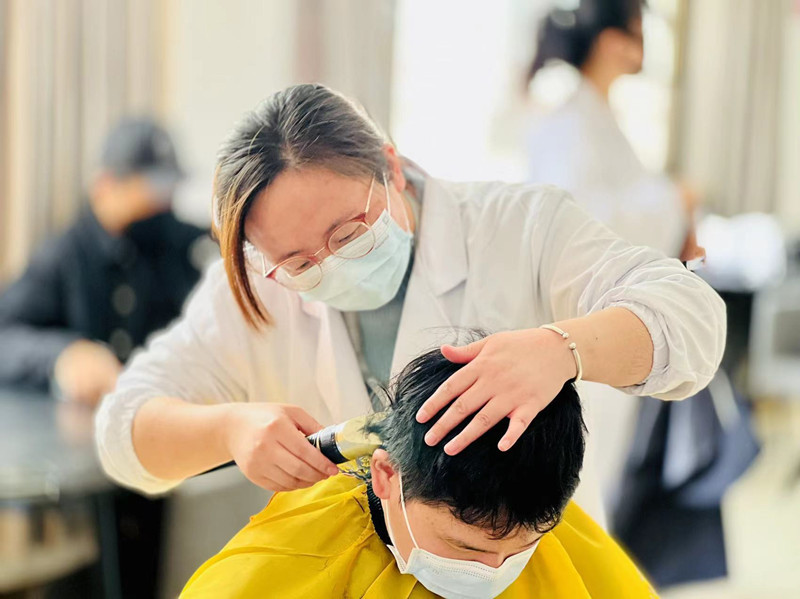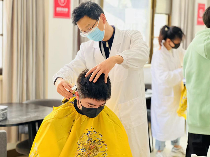活动一经发出,即有一百余名同学报名。理发现场严格按照疫情防控要求,所有人员需佩戴口罩,保持安全距离,体温监测、消毒处理每一个环节都不能少。推剪、打薄、修边……活动现场,“理发师们”耐心询问“小客人”对发型的要求后,便认真娴熟地修剪起头发来。伴随着剪刀、电动理发器的咔嚓声、嗡鸣声以及“理发师”与学生们和乐融融的谈笑声,学生们原本凌乱的头发变得干净利落,面容也精神了许多。