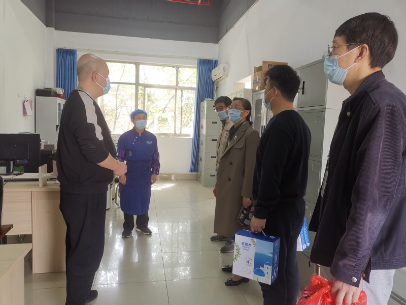 4月8日上午,校党委委员、副院长赵玲珍代表学校走访慰问奋战在疫情防控一线的后勤保障部工作人员,送来了学校的关心、关爱,后勤保障部门负责人参加了慰问活动。赵玲珍副院长一行先后走访了教工餐厅、卫生保健中心、33栋学生公寓、高配维修、西门进校货物消杀区等防疫一线工作区域,认真听取了工作人员针对食堂工作、师生核酸检测、后勤防疫工作、公寓服务工作开展情况,对后勤保障部员工舍小家顾大家,20多天日日夜夜坚守在岗位,守护师生的健康,付出的辛勤劳动表示感谢,对他们良好的工作状态、扎实的工作作风予以赞扬,并反复叮嘱大家,做好防护,保护好自己。
