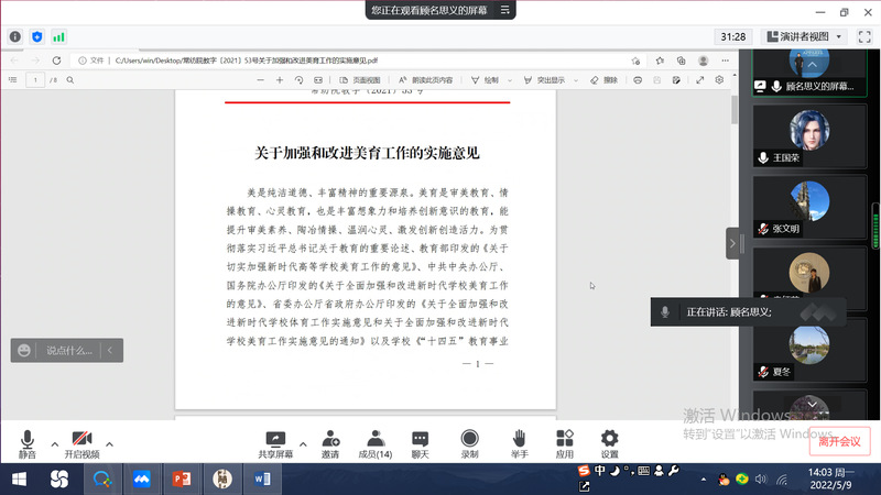 顾明智结合上级文件精神,2022年学校党政工作要点,向大家详细解读并一起学习了常纺院教字【2021】53号《关于加强和改进美育工作的实施意见》。各二级学院和有关职能部门围绕美育工作,从课程建设到文化展示;从美育主题教育到实践平台搭建;从课程体系完善到项目工程推进;从师资能力提升到教育教学评价;从美育理论研究到优秀文化宣讲;从人才培养机制到“1+N”美育课题指南;从思政课程、课程思政到德智体美劳全面发展;从彰显民族文化自信到对外文化交流;从创新创业到美学设计融合发展;从校园文化到社团活动等诸多方面,将自身的做法和思考作了详细的汇报和交流,内容丰富,给人启发,令人深思。