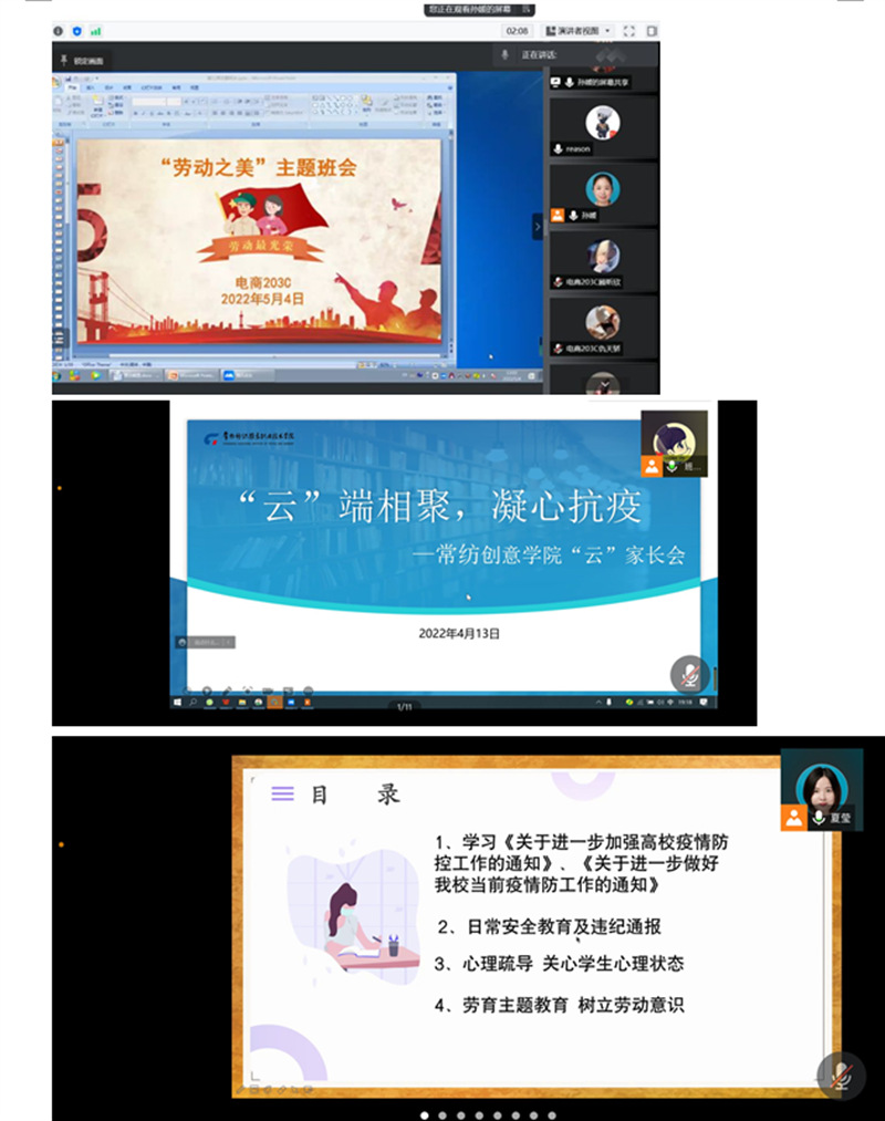 2022年5月15日-5月18日组织师生召开线上线下劳动教育期中座谈会,在座谈中了解到,通过本门课程的学习深刻认识到劳动是人类产生的源泉,树立马克思主义劳动价值观,劳动创造人类、劳动创造美好生活。任课教师多采用多种教学手段和方法,调动同学上课积极性,在生活中感受劳动之美,通过PPT汇报形式,展示实践成果,将难懂的知识点从生活实际解读,陌生的概念和生活经验相结合;总体上线上教学时间产生疲倦心理,也提出同学之间互相监督,从签到、互动、作业反馈等多角度,引导学生意识到劳动的重要性,将“劳”、“育”同时展开学习。