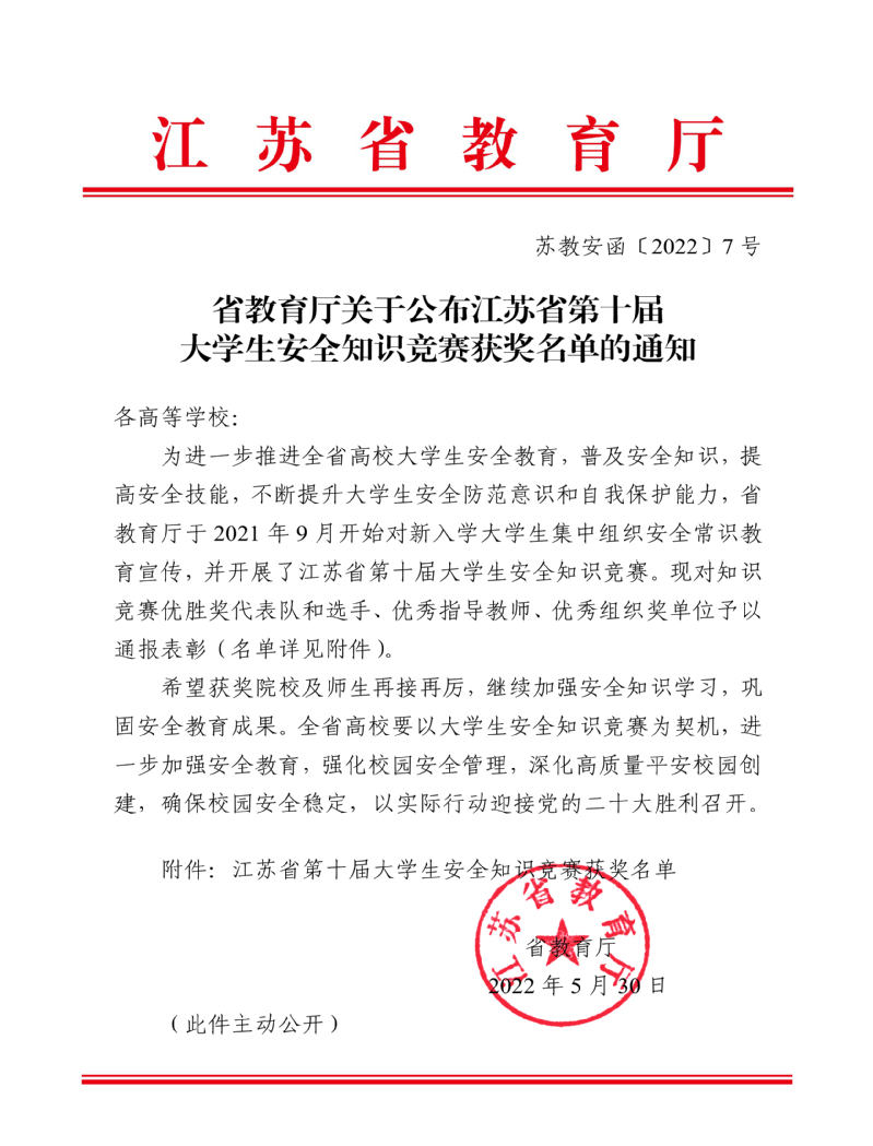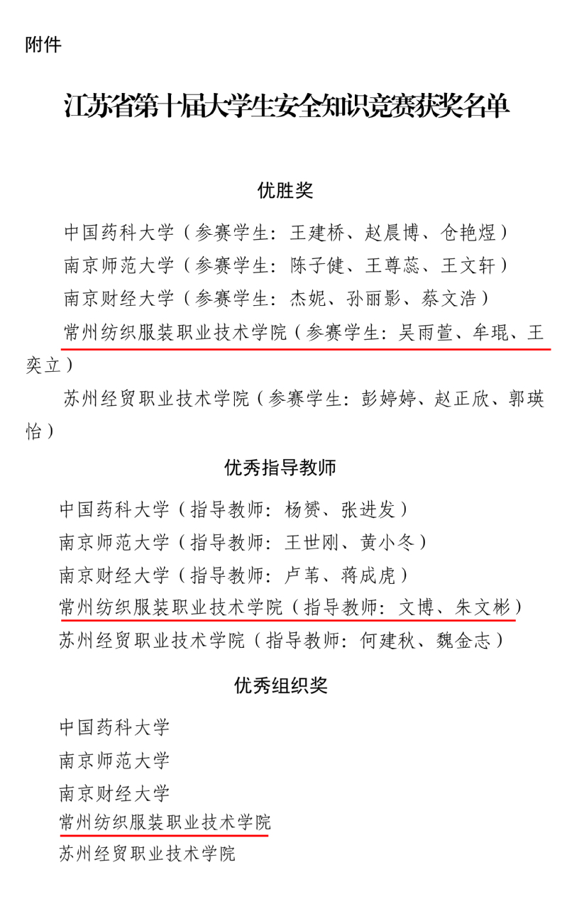 近日,由江苏省教育厅主办的“江苏省第十届大学生安全知识竞赛”落下帷幕,由永利官网创意学院牟琨、人文学院王奕立、服装学院吴雨萱三位同学组成的校代表队以总分286分的成绩获得比赛优胜奖(锡常片区本专科组第一名),永利官网保卫处文博老师和创意学院朱文彬老师获评优秀指导教师,学校荣获优秀组织奖。据悉,全省158所高校的大学新生参加了此次比赛,经过层层选拔,最终仅有20所高校代表队获得比赛最高奖项:优胜奖。