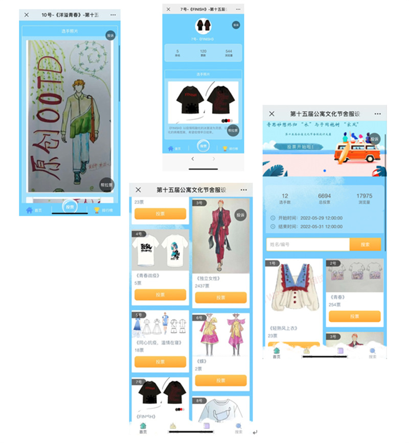 5月10日—5月30日服装学院承办“奇思妙想终衣归,与子同袍树家风”舍服设计大赛。各二级学院以宿舍为单位上报3-5份宿舍集体作品,舍服设计大赛为同学提供展示平台,通过广泛讨论、合理分工、精心设计、通力合作,增强同学们宿舍凝聚力,创新力、专业能力,更是以比赛的形式提高学生综合能力,促进学生的全面发展。经过初审,共有12件作品进入网络投票与专业评审阶段。近1000余名同学为22件作品投了6694票。