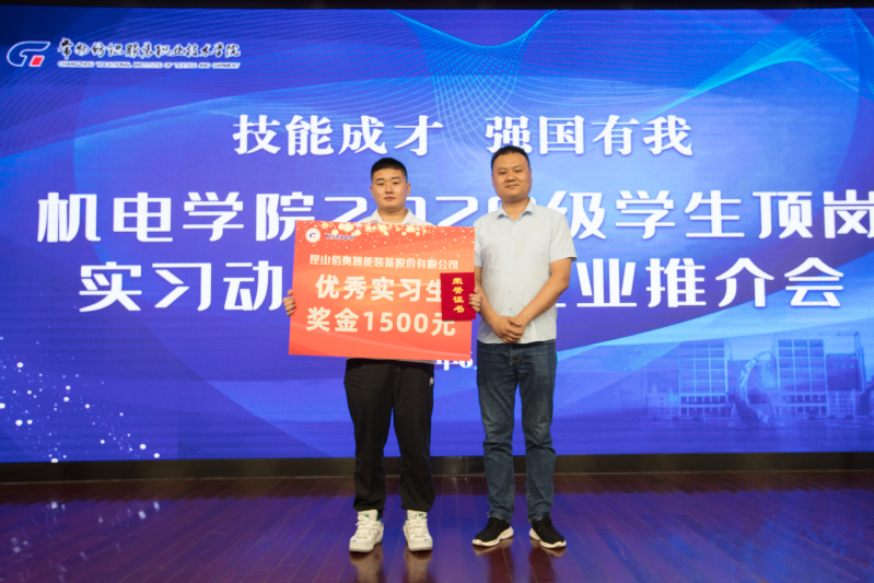 昆山佰奥智能装备股份有限公司工程主管蔡荣军为机电学院优秀实习生颁发奖金,机电学院2019届毕业生蔡子涵、魏超祥自2021年7月进入公司以来,工作积极主动,认真负责,吃苦耐劳,责任心强,表现突出,起到了模范带头作用,两人获评昆山佰奥智能装备股份有限公司“年度优秀实习生”称号。蔡子涵作为优秀实习生代表与现场学生分享了实习经历与切身感受,他认为实习生只要一直保持认真的工作态度,踏实肯干,责任心强,想学的就一定可以学到。