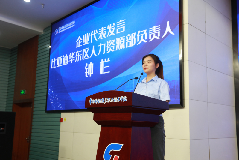 比亚迪华东区人力资源部负责人钟栏女士作为企业代表进行发言,她强调,机电学院实施的2+0.5+0.5顶岗实习人才培养模式更贴切多数企业人才储备需求,作为企业将认真领会职业院校学生实习管理规定,与机电学院积极沟通配合,切实做好顶岗实习的选拔、组织、管理、考核等工作,扎实有序地开展顶岗实习学生指导,立足长远,确保学生都能招得进、学得透、用得好、留得住。